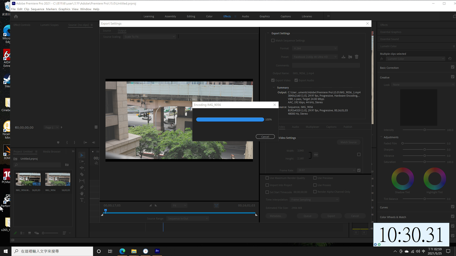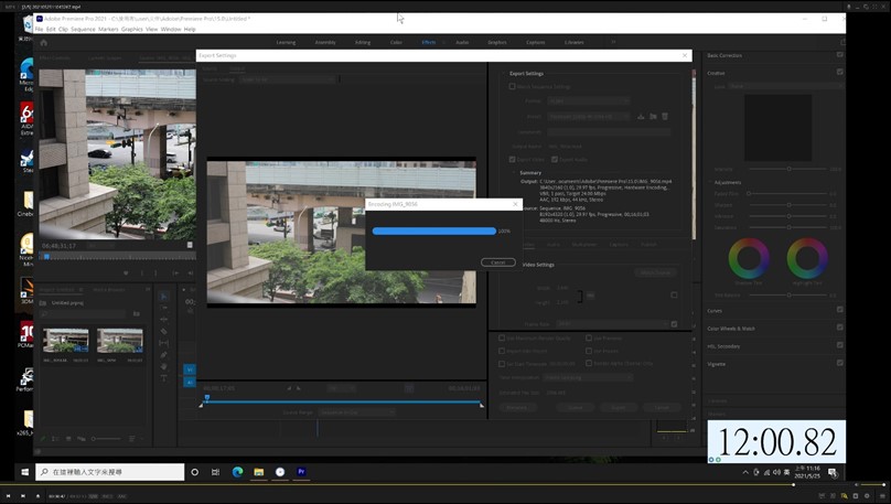 影片轉檔部分使用 Adobe Premiere Pro 2021 處理 8K30P 的高解析度影片,調色處理轉檔為 H.264 網路常用的 Facebook 4K 格式,一樣測試 16GB 與 32GB 記憶體配置下的轉檔時間差異。