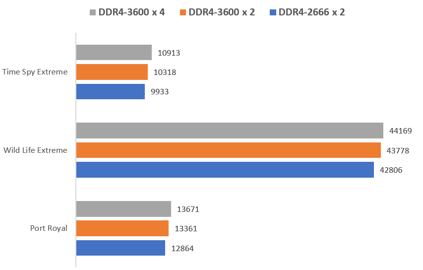 記憶體的速度和容量也很直接影響到大型圖形運算上的差異,測試 3D 性能為主的 3D Mark 分別測試 Time Spy Extreme 對於 4K 高強度遊戲、 Wild Life Extreme 跨平台測試與 Port Royal 光追測試,在提升時脈與大容量都有約 5% 的性能提升