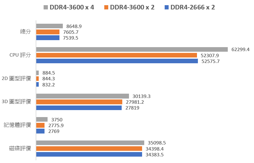 DDR4-2666 16GB 雙通道測試,這裡因為是使用獨立顯卡,三種測試的分別不大。不過如果用的平台內建顯卡,例如如 AMD 的 APU,記憶體速度與容量的影響就會相當明顯。