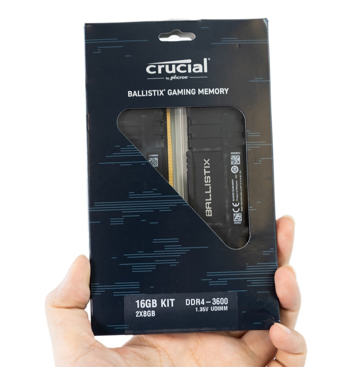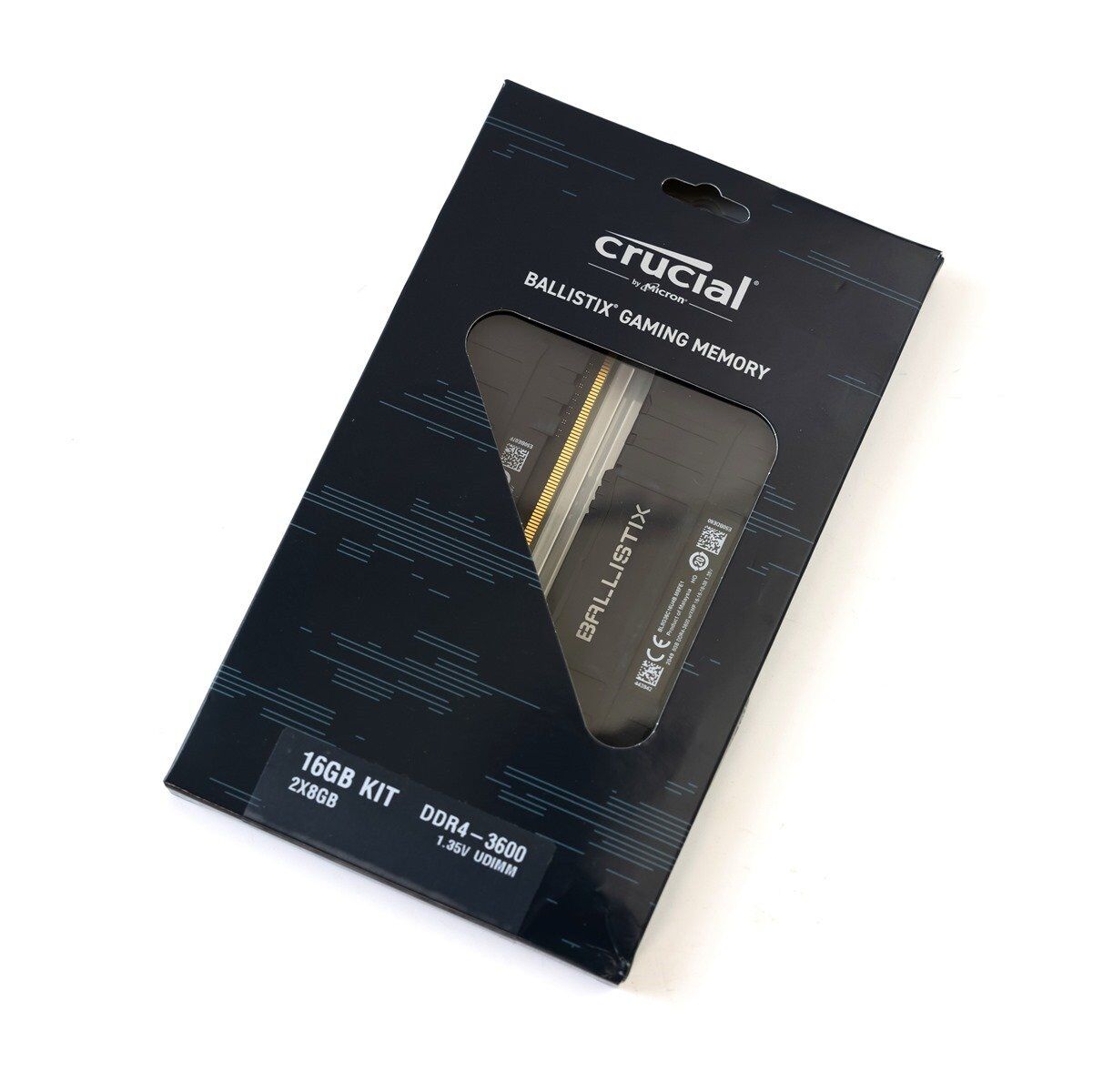 Crucial Ballistix 記憶體包含了 4GB / 8GB / 16GB / 32GB 各種不同大小單條容量與不同速度的版本,阿輝今天測試的可以說是最受歡迎的 DDR4-3600 的 16GB Kit 組合(每組內含兩條 8GB 記憶體),Kit 組是廠商推出針對雙通道/四通道等需求推出的 2/4 組記憶體的套裝,與分開買單支相比可以避免記憶體混搭可能發生的相容性問題;Crucial Ballistix DDR4-3600 記憶體 Kit 的包裝為紙盒+透明泡殼固定包裝(非一次性包裝),包裝上也直接標示為 DDR4-3600 1.35V 的 UDIMM 規格