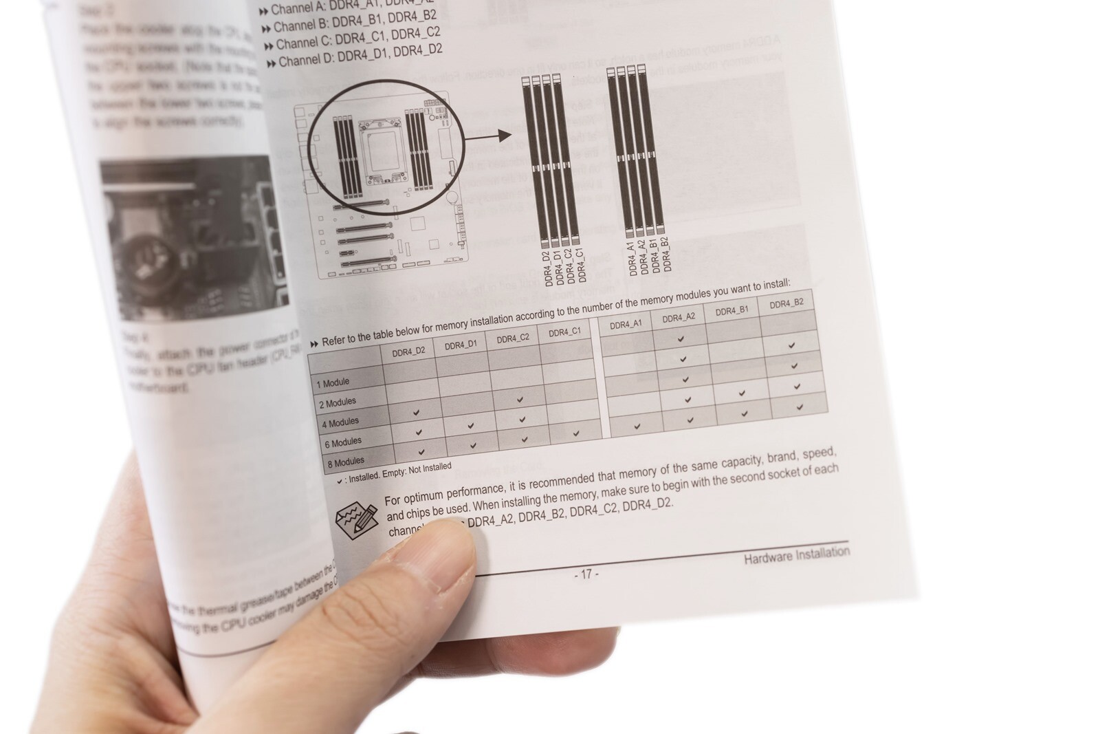 安裝的時候建議也可以參考主機板說明書,會有建議在不插滿插槽的情況下,怎樣的優先安裝位置,例如這張版子在兩條雙通道的情況優先安裝 A2/B2,四條四通道的情況優先安裝 D2/C2/A2/B2
