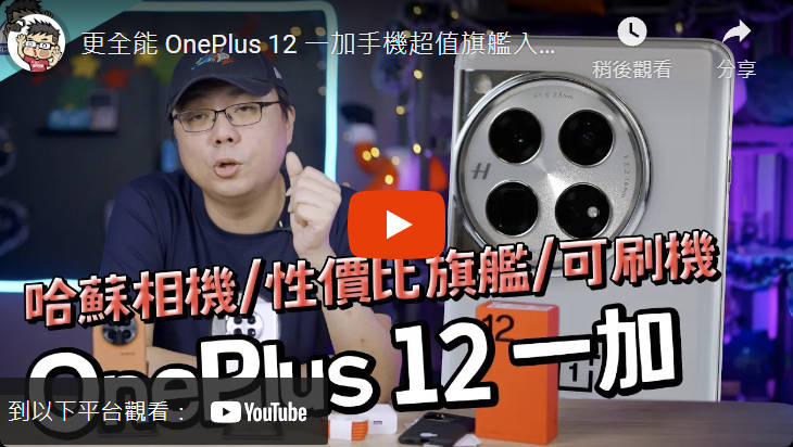 0 智慧手機開箱評測 2024-02-14 由 廖阿輝 · Published 2024-02-14 · Last modified 2024-02-16 [影片] 更全能 OnePlus 12 超值旗艦入手評測分享 + GT5 Pro 對比選購建議 -馬上訂閱阿輝 Youtube 頻道https://reurl.cc/rDY03合作邀約請寄 [email protected]加入阿輝的 Line@ 官方帳號@ahui3追蹤阿輝最新訊息官方網站 https://ahui3c.coFacebook https://ift.tt/gDApCi閱讀全文